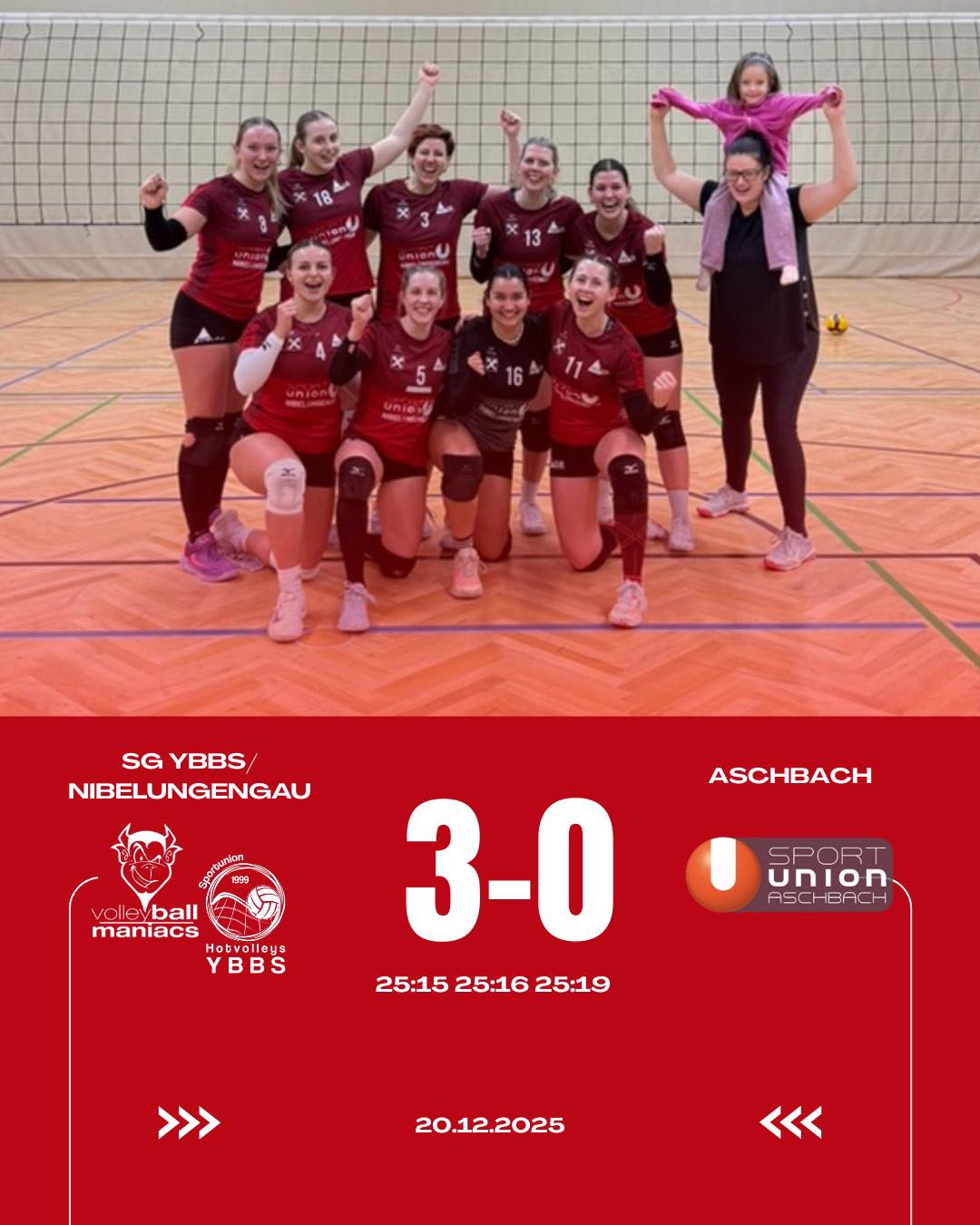 Die SG Ybbs–Nibelungengau setzte sich im Heimspiel gegen den SVA Aschbach mit 3:0 durch. Von Beginn an agierte das Team konzentriert und bestimmte das Spielgeschehen. Der erste Satz ging mit 25:15 klar an Ybbs–Nibelungengau, auch im zweiten Durchgang ließ man beim 25:16 nichts anbrennen. Im dritten Satz zeigte Aschbach mehr Gegenwehr, dennoch behielt die SG Ybbs–Nibelungengau die Kontrolle und entschied auch diesen Satz mit 25:19 für sich. Insgesamt ein solider Auftritt ohne Satzverlust.