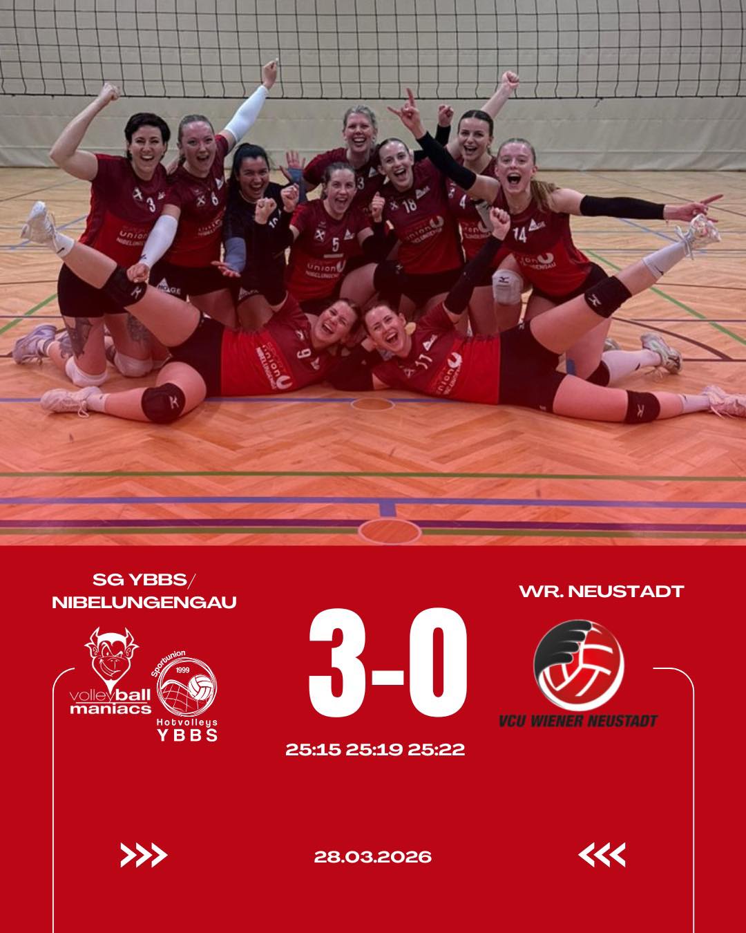 Die Damen gewannen gegen Wr. Neustadt mit 3:0. Der dritte Satz war ein wahrer Krimi. Die Damen konnten einen 11 Punkte Rückstand aufholen und den Platz als Sieger verlassen.